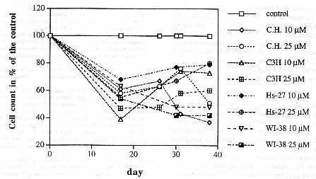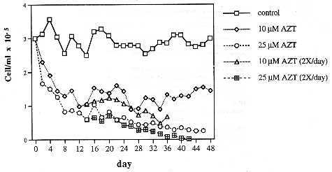 Results The effect of long-term AZT treatment on the viability of the human CEM T-cell line. To determine the cytotoxicity of AZT on the human CEM T-cell line in culture, parallel cultures were incubated with 10 µM, 25 µM AZT and without AZT (see Materials and methods). The untreated cells were maintained at saturation density of CEM cells, which is about 3 x 105 cells per mL in our conditions. Each culture was divided 2-fold every 48 h, by which time the AZT-free control had regained saturation density. As can be seen in Fig. 1, after four days the cell count of the culture at 25 µM AZT had been reduced to half of the control, and that of the culture at 10 µM AZT to two thirds of the control. After 12 days the cell densities of both AZT-treated cultures had been reduced to a third of the control culture. From then on, the density of the culture at 25 µM AZT continued to decline at a decreasing rate, and that of the culture at 10 µM AZT stabilized (Fig. 1). One possible explanation of the decreasing sensitivity of surviving CEM cells to AZT over time is that the dividing portion of the cells takes up all AZT in a short time, and that the resting portion of cells subsequently enters mitosis in a culture depletod of AZT. Another explanation suggests that variants are selected that do not incorporate AZT into DNA. To distinguish between these possibilities each AZT-treated culture was further divided into two. One of the two subcultures was maintained with daily medium changes containing 10 and 25 µM AZT respectively as before. The other subculture was supplemented, 12 hours after the medium including AZT had been changed, with the equivalent of an extra 10 and 25 µM AZT respectively. All cultures were further incubated under these conditions for another 32 to 36 days. It can be seen in Fig. I that even at two daily applications of AZT at 10 µM, a decreasing fraction of T-cells retained viability for 14 days (when the culture became contaminated). However, no survivors were observed after 14 days at two daily applications of 25 µM AZT. It is concluded that T-cell variants are selected, on long-term exposure to AZT, that are relatively resistant to AZT compared to the average T-cell prior to treatment. The effect of long-term exposure to AZT on the viability of human and animal fibroblasts. To determine whether other human and animal cells are similar to human T-cells with regard to AZT-sensitivity, the viability of a human lung (WI) and foreskin (Hs) cell line, of a mouse cell line (C3H) and of secondary Chinese hamster cells (C.H.) was studied in AZT. Each of the different cell types was seeded at 1 x 105 cells per 10 cm dish and exposed to AZT at 10 and 25 µM (see Materials and methods). AZT was added to each dish twice every day, once in the morning and again at night as described above. The inhibition of cell growth was expressed as the percentage of cells in the AZT culture compared to that of the untreated control. The cells were counted by the time the control had reached confluency (Fig. 2). The first count of cells was taken at the end of two weeks when all control dishes had become completely confluent. Thereafter control cells were split 1:4 and allowed to reach confluency again. This process was repeated several times as shown in Fig. 2. As can be seen in Fig. 2, the general pattern of AZT-sensitivity observed with T-cells was confirmed with other human and animal cells. C3H mouse cells appeared to be most sensitive to the effects of AZT. At day 14, the densities of C3H cells, maintained at both concentrations of AZT, had already declined to below 50 percent of the control. Possibly due to a counting error, the density of C3H cells at 10 µM AZT appeared lower than that of cells at 25 µM AZT. After the same time, the concentrations of Hs-27, WI-38, and C.H. cells ranged from 50 to 60 percent of the control at 25 µM AZT, and from 60 to 70 percent of the control at 10 µM AZT. From 14 to 38 days of AZT treatment all fibroblast cells remained at about half the density of the controls. However, the densities of C3H and Hs-27 cell lines gradually increased over time at both concentrations of AZT. By day 38, the density of Hs-27 cells at both AZT concentrations had reached up to 80 percent of the control.