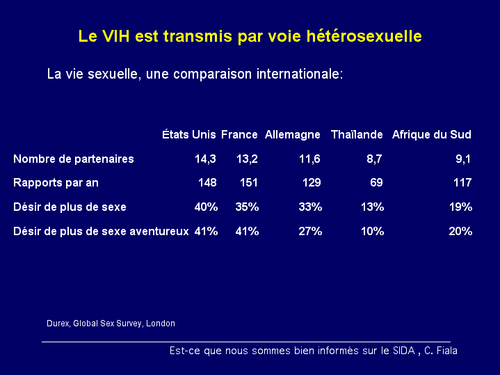 CommentaireAutre chose intéressante : on parle aussi de la vie sexuelle dans les pays dAfrique et en Thaïlande qui expliquerait apparemment une transmission hétérosexuelle. La société Durex, producteur de préservatifs, a fait une comparaison de la vie sexuelle internationale. Les pays européens et les États-Unis sont parmi les pays où le nombre de partenaires est beaucoup plus élevé quen Thaïlande ou en Afrique. Ceci entre en contradiction avec une maladie sexuellement transmissible dans ces pays-là. Suite |