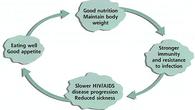 Good nutrition is also vital to help maintain the health and quality of life of the person suffering from AIDS. Infection with HIV damages the immune system, which leads to other infections such as fever and diarrhoea. These infections can lower food intake because they both reduce appetite and interfere with the body's ability to absorb food. As a result, the person becomes malnourished, loses weight and is weakened.