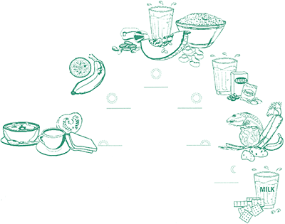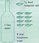 Drink about eight cups of water per day and even more if you are suffering from diarrhoea, vomiting or fever. You can also drink fruit juice, soups and other beverages. Collect your water from a protected source and store it in a clean container. If the water is not from a protected source it should be boiled for ten minutes and cooled down afterwards before drinking. Avoid drinking tea or coffee with a meal, as they reduce the iron the body gets from your food.