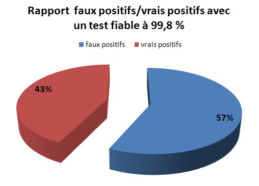 En France, si les test étaient fiables à 99,8 %, avec un pourcentage de séropositif de 0,15 % sur l'ensemble de la population, le pourcentage de faux positifs parmi ces 0,15 % serait alors de 57 %, soit 57.000 faux positifs sur les 100.000 séropositifs français.