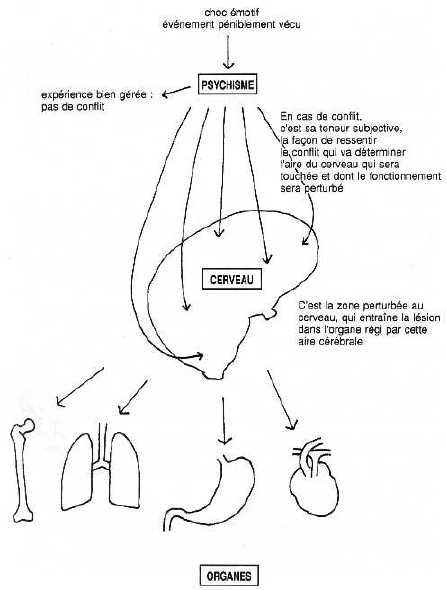 Mais c'est par son psychisme que l'individu aborde la réalité de l'existence et de ses difficultés: il s'agit donc de sa réalité à lui, de la façon dont lui ressent les événements de sa vie. Tant qu'il peut "gérer" mentalement ces difficultés - par exemple en les anticipant ou en disposant d'assez de ressources acquises dans son histoire antérieure - il ne sera pas malade. Il vivra éventuellement des émotions plus ou moins fortes et désagréables mais qui se résoudront vite avec comme seules conséquences quelques perturbations fonctionnelles et temporaires. C'est par exemple une période d'insomnie par surcroît de préoccupations; un estomac noué après une dispute banale; un besoin plus fréquent d'uriner, des transpirations ou des battements de cur dans l'appréhension d'une rencontre etc... Rien que des "secousses" autour d'un centre de gravité qui reste stable mais qui entraîne déjà des répercussions sur le système nerveux et donc un "langage du corps".
