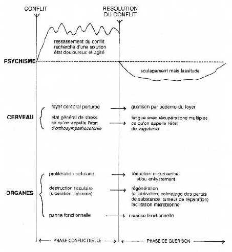 On peut maintenant dépeindre le canevas général de toute affection. La première phase conflictuelle commence dès le début du conflit. Sur le plan psychique, le malade témoigne de son conflit par ses pensées, ses sentiments, ses comportements; en un mot par son ressenti douloureux et persistant. Son système nerveux est globalement modifié (phase d'orthosympathicotonie) et montre les signes de ce qu'on appelle l'état de stress: il en perdra plus ou moins fort le sommeil, I'appétit, la joie de vivre etc... et aura des symptômes généraux de nervosité. En outre la perturbation d'une zone précise du cerveau provoquera la détérioration de l'organe correspondant à cette zone. La solution du conflit stoppe l'évolution des perturbations aux trois niveaux. Mais la maladie complète ne s'arrête pas pour autant: à ce stade l'organisme se retrouve avec diverses dégradations et c'est tout aussi spontanément que vont se mettre en route les processus de réparation prévus par la nature bien avant l'avènement de la médecine. Le système nerveux se branche sur un rythme de récupération (phase de vagesympathicotonie, encore appelée vagotonie): sensation de fatigue et besoin de se reposer; reprise du sommeil et de l'appétit s'ils étaient perturbés, d'une meilleure circulation sanguine. Au niveau cérébral, le foyer préalablement atteint va se congestionner et cet oedéme va déjà expliquer plusieurs symptômes propres à cette deuxième phase mais toutes ces modifications cérébrales sont temporaires et le tissu nerveux non seulement reste fonctionnel mais redevient performant: il gère à nouveau l'intégrité des organes correspondants qui vont se réparer. Enfin sur le plan organique, cette autoguérison se traduira par un cortège de symptômes qu'il faut bien savoir décoder.