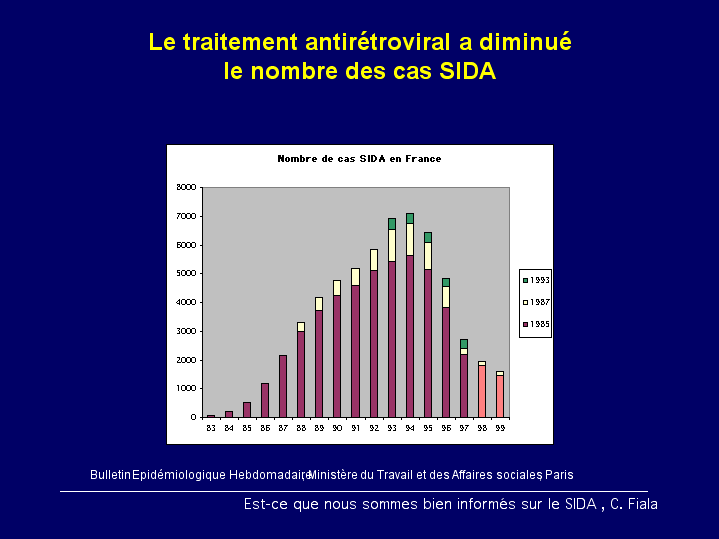 CommentaireOn nous dit que grâce au traitement antiviral, on a pu maîtriser des cas de sida. Je reviens sur cette statistique française qui est aussi valable pour tous les autres pays européens. La trithérapie a été introduite en 1996 environ. Le nombre de cas avait déjà diminué deux ans auparavant. Cela montre que si jamais cette thérapie a eu un effet sur le nombre de cas sidéens, elle était vraiment hautement active deux ans auparavant ! Suite |