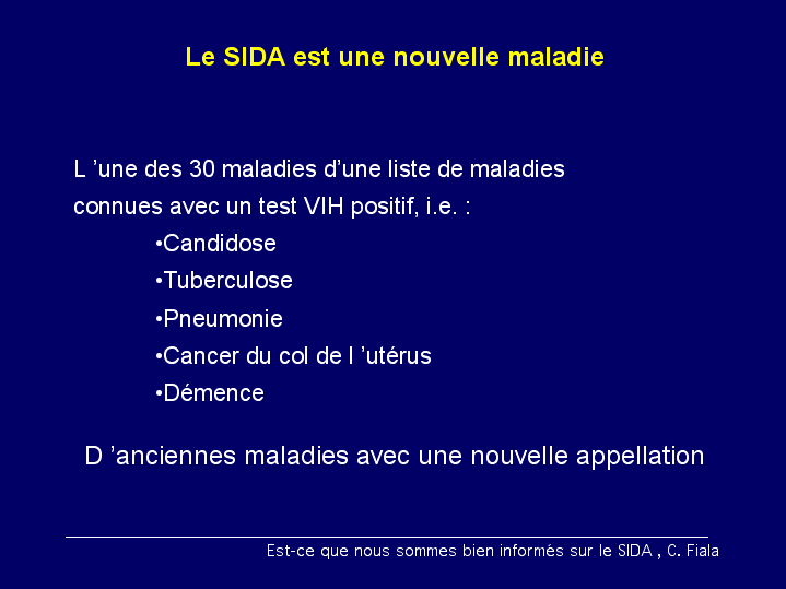 ![]() CommentaireEn fait, le sida est une maladie par définition. Ce nest pas une nouvelle maladie proprement dite, mais cest un ensemble de maladies caractérisées par un test VIH positif, maladies que lon connaissait déjà, et que lon peut traiter plus ou moins bien. (Cest au moins la définition pour lEurope et les États-Unis). Suite |