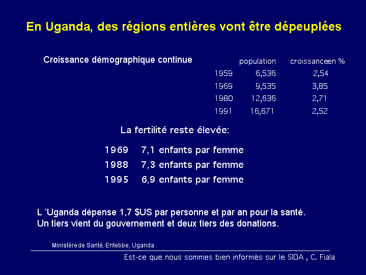 CommentaireUne autre affirmation : lOuganda va être dépeuplé à cause du sida. Cest intéressant de voir que le plus grand problème en Ouganda jusquà ce jour-là cest la courbe de croissance démographique qui ne cesse daugmenter (20 millions actuellement). La fertilité reste élevée : une femme a en moyenne 7 enfants. Vous voyez sur ce rapport que "lépidémie de sida" na pas changé beaucoup de choses. Malheureusement le taux de croissance démographique na pas pu être maîtrisé en Ouganda qui est un pays très pauvre : 30 % de la population seulement a accès à leau potable, et la dépense annuelle de santé par personne est de 1,70 $ US cest à peu près le prix dun test de dépistage du VIH. La question est de savoir si cest vraiment la priorité pour les pays pauvres. Suite |